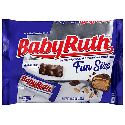 It's time to get your sweet treat on with Baby Ruth Fun Size candy bars in a shareable bag. These peanuty, chocolatey and perfectly sized bars are small in size but big on taste. Packed with dry roasted peanuts, rich caramel and smooth nougat, these individually wrapped candy treats are easy to snack on and enjoy. The shareable pack lets you take these irresistible chocolate bars anywhere and share with anyone. They're great for the home or office candy bowl, parties, get-togethers, dessert or a movie night sweet treat. Baby Ruth is made with no artificial flavors or colors. Baby Ruth Fun Size candy bars are the treat everyone knows and loves.