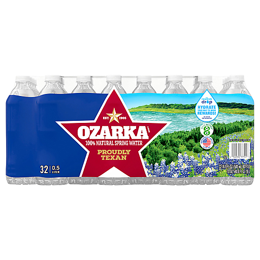 Get back to nature with Ozarka Brand 100% natural spring water. Carefully sourced from three natural springs located in the great state of Texas, it contains naturally occurring electrolytes for a crisp, clean taste you'll love. And with a better bottle made with 100% recycled plastic* and 100% recyclable, you know that you're not just getting the best that nature has to offer, you're doing your best to help us conserve it too. So grab a pack and get ready for whatever fuels you. Ozarka water is available in a variety of sizes, so you can easily stay hydrated no matter where you are. From your gym bag to your hiking pack, on the go or at home, you can pick up the perfect size for wherever your life takes you. Stock the fridge so your family always has crisp, refreshing hydration on hand. Plus, the more you drink, the more you can earn with The Rewards Drop. Get points with every purchase toward event tickets, merchandise and more – see packaging for details. It's one more reason to enjoy the big, crisp, refreshing taste that's been making Texas proud since 1905. *20 oz, 700mL, 1L, 1.5L still water bottles only. Excludes label and cap.